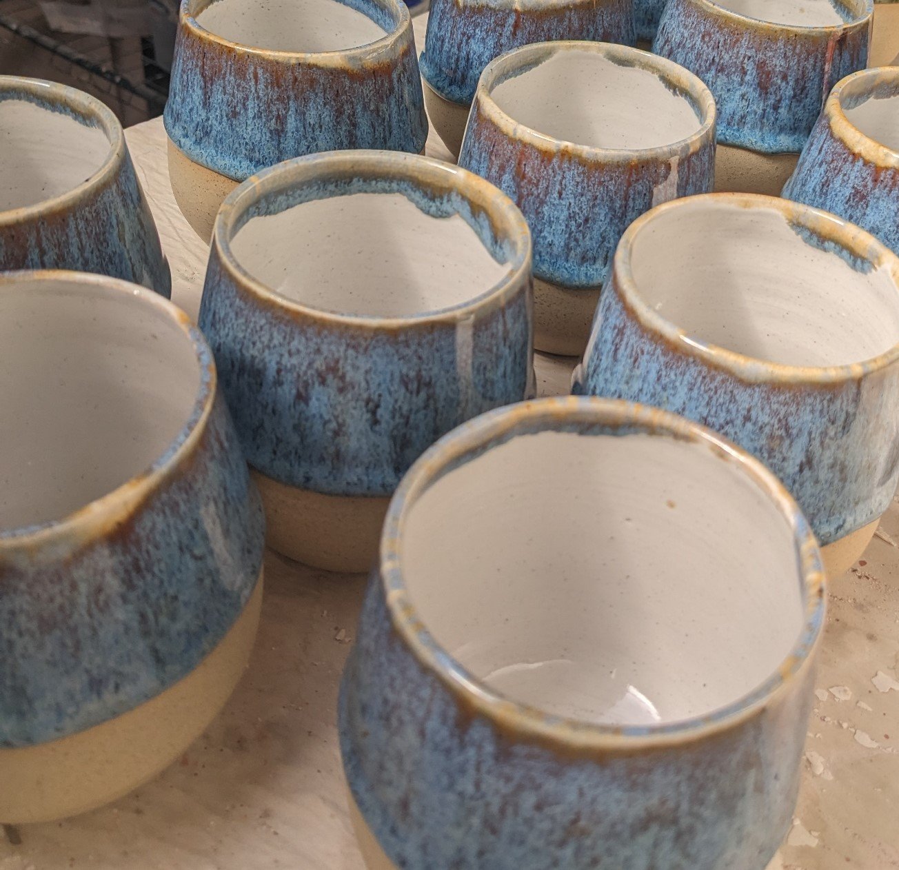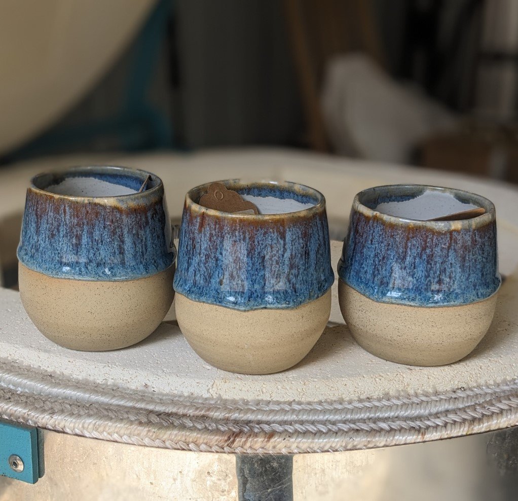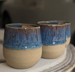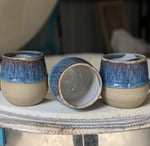 Sandy buff stoneware cup (no handle) in Blue Sunset glaze with white interior.