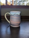 Pink/purple coloured porcelain mug with White Cliffs Opal glaze. This mug was glaze fired twice, causing small bloated areas within the clay. This is purely cosmetic, but enough for me to discount it. Holds 410ml.