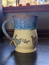 Buff stoneware mug with chicken transfer and Blue Sunset glaze combo. White liner glaze. Holds 540ml.