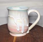Coloured porcelain mug (pink, green and white) with Neodymium and White Cliffs Opal at the top and Southern Ocean interior. Holds 330ml.