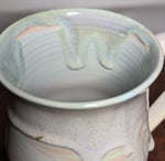 This is a nice mug from my last batch of rainbow porcelain, where I played fast and loose with fluxy glaze combinations and mostly got away with it. This beauty has a bit of a crawl inside the rim where the three glazes meet. With all those drips it is not a candidate for re-firing.