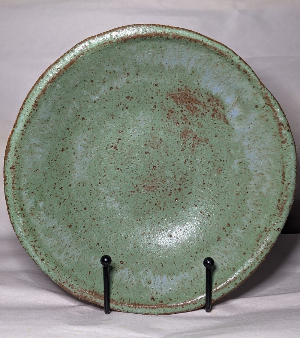 Hand built bowl in coarse stoneware clay. 19cm internal diameter, 5.5cm tall. Base is diamond sanded. In Ocean Break glaze, unglazed on outside.