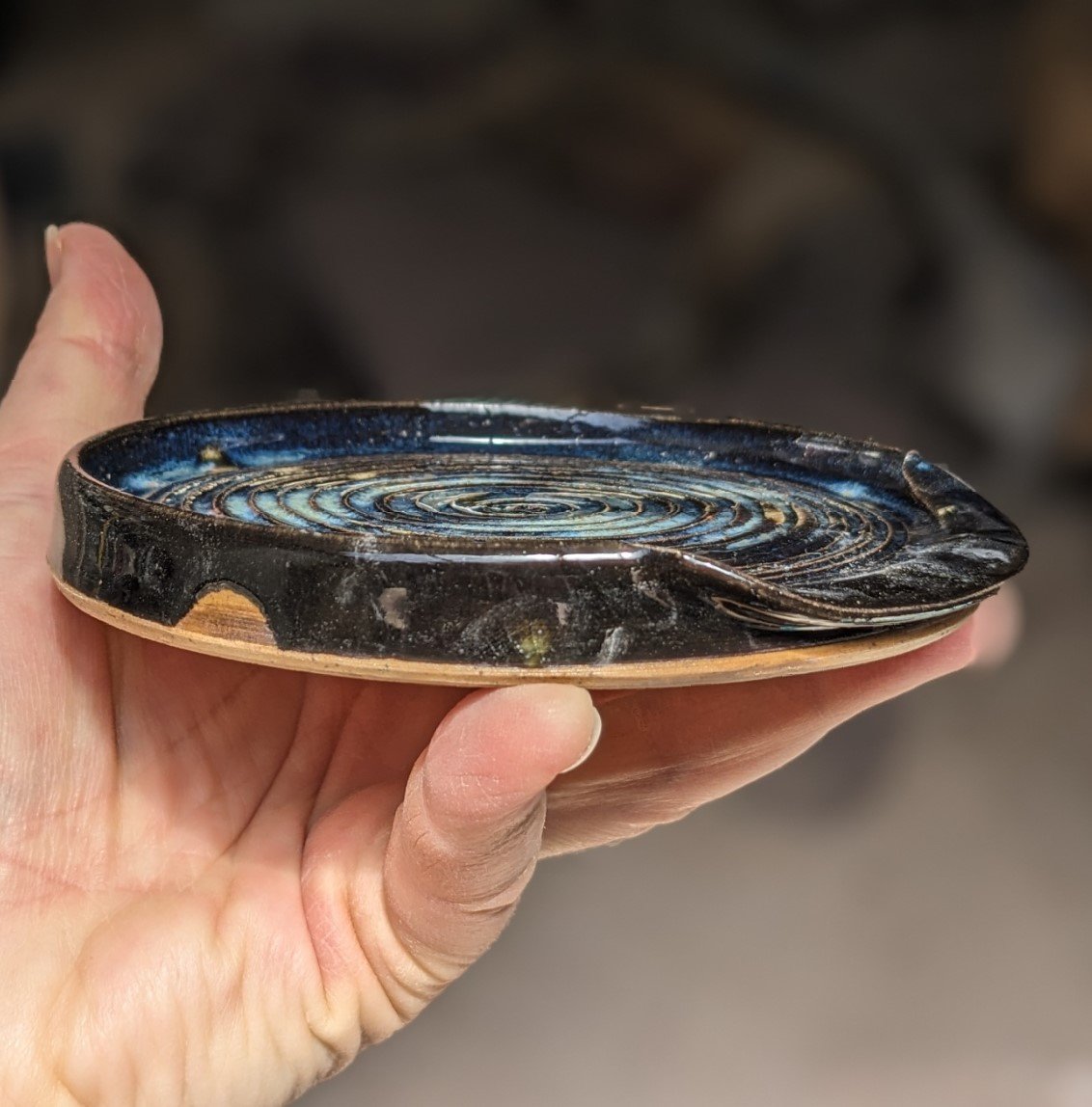 12-13cm diameter spoon rests in sandy buff clay.